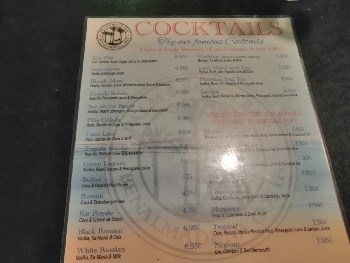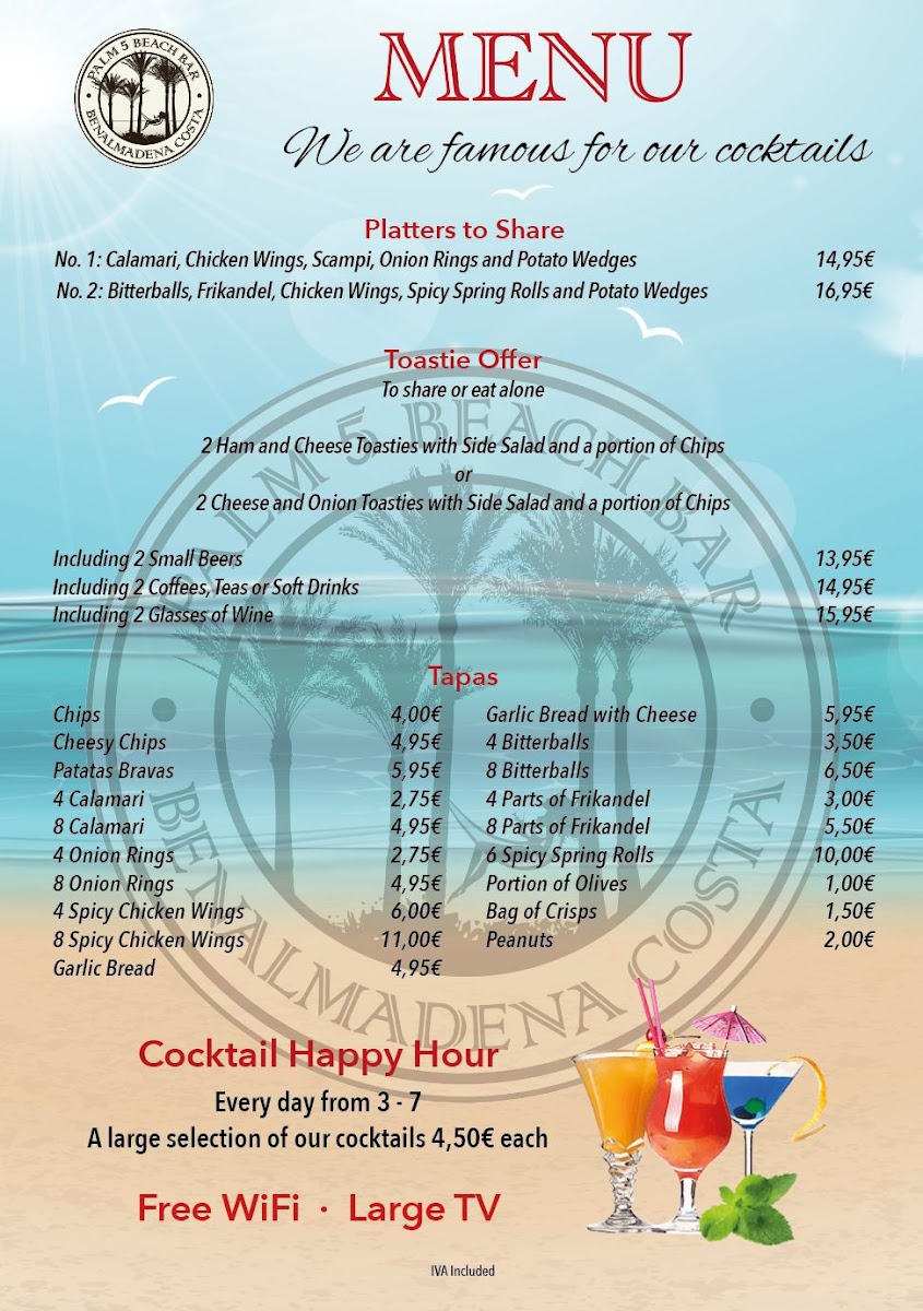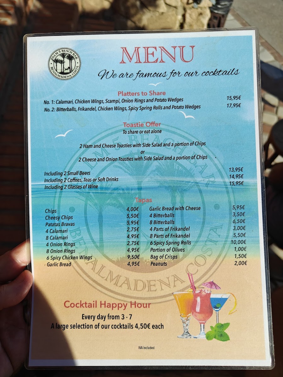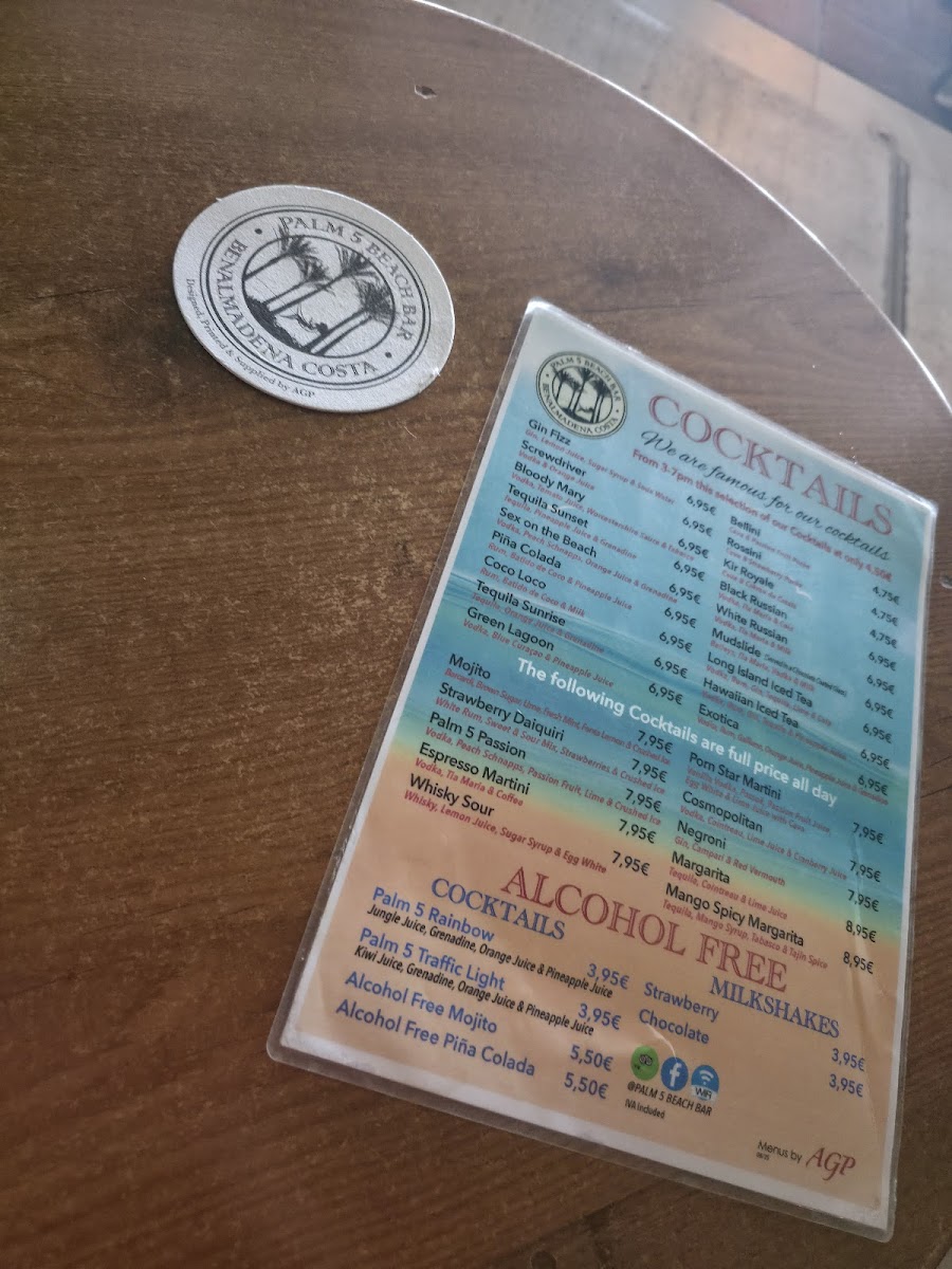 Palm 5 Beach Bar offers a vibrant menu that perfectly complements its stunning beachfront setting in Benalmádena. Known for its expertly crafted cocktails like the Spicy Mango Margarita and refreshing Pina Colada, this lively bar pairs drink excellence with tasty bar snacks and light bites. Highlights include the highly praised Chicken Burger with Bacon and Cheese, celebrated for its rich flavors and satisfying quality. The menu leans towards casual yet flavorful options, ideal for those seeking enjoyable food alongside expertly mixed drinks. Customer feedback points to consistently fresh, well-prepared dishes served with prompt and friendly service. Whether you’re here for a midday bite or sunset cocktails, Palm 5 Beach Bar delivers a memorable experience marked by inventive drinks, great value, and a relaxed atmosphere with views of the coast. It’s an inviting spot where the food and drinks come together seamlessly to elevate your beachside moments.