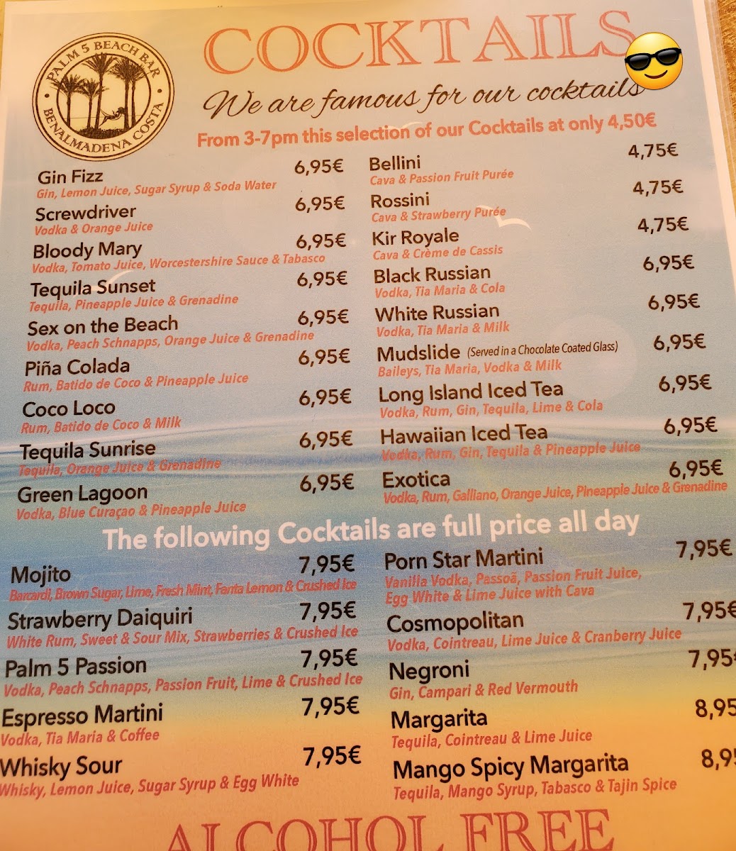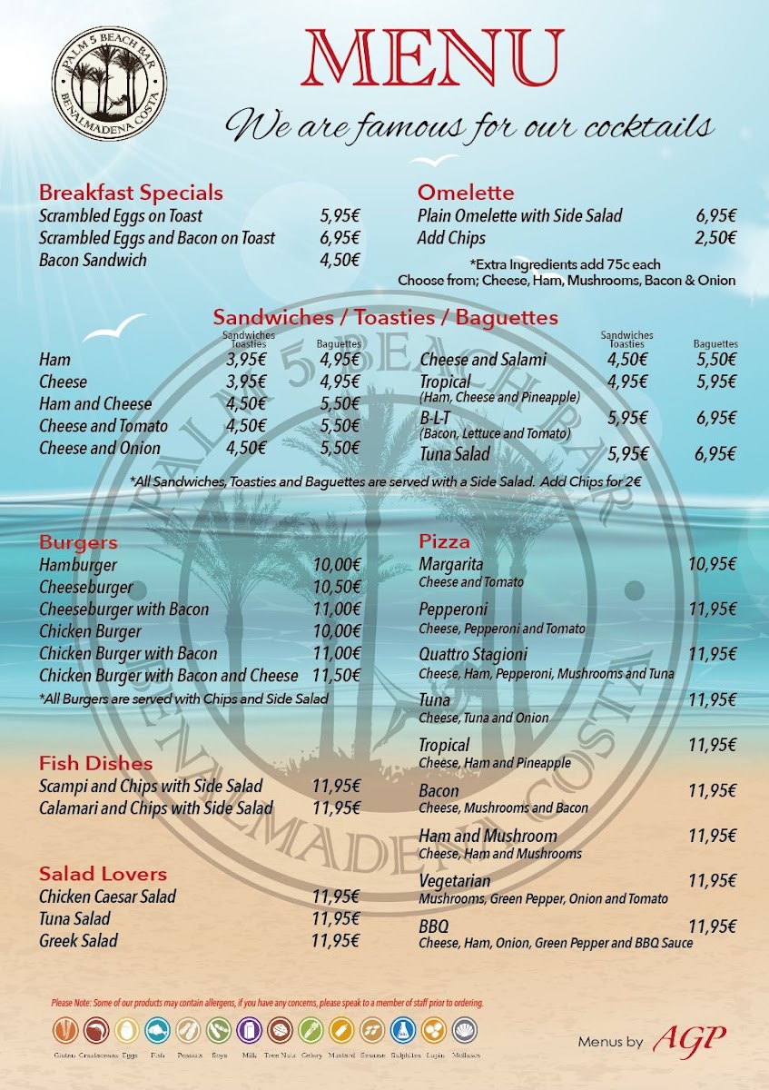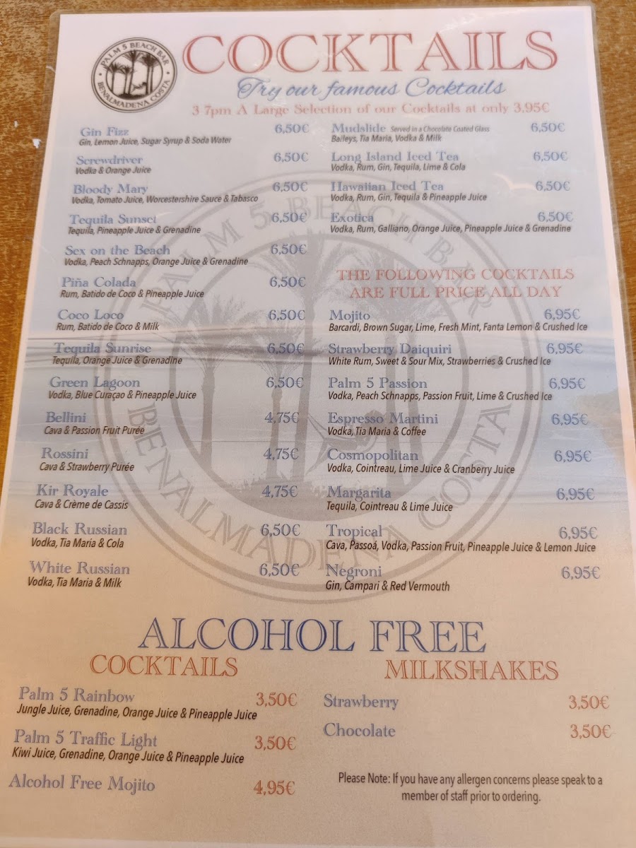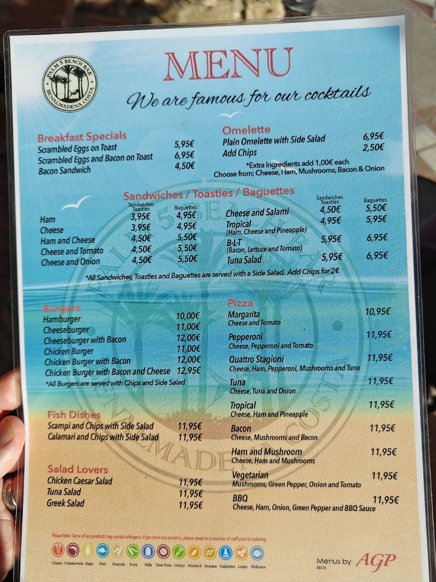 Palm 5 Beach Bar offers a vibrant menu that perfectly complements its stunning beachfront setting in Benalmádena. Known for its expertly crafted cocktails like the Spicy Mango Margarita and refreshing Pina Colada, this lively bar pairs drink excellence with tasty bar snacks and light bites. Highlights include the highly praised Chicken Burger with Bacon and Cheese, celebrated for its rich flavors and satisfying quality. The menu leans towards casual yet flavorful options, ideal for those seeking enjoyable food alongside expertly mixed drinks. Customer feedback points to consistently fresh, well-prepared dishes served with prompt and friendly service. Whether you’re here for a midday bite or sunset cocktails, Palm 5 Beach Bar delivers a memorable experience marked by inventive drinks, great value, and a relaxed atmosphere with views of the coast. It’s an inviting spot where the food and drinks come together seamlessly to elevate your beachside moments.